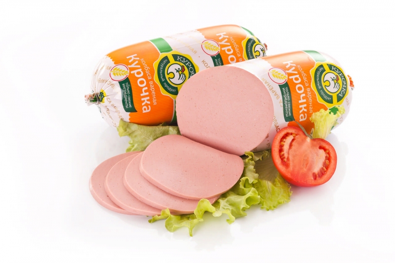 Третий сорт. Состав: мясо птицы механической обвалки, вода питьевая, эмульсия из шкурки, мука пшеничная, белок соевый, крахмал картофельный, молоко сухое, смесь посолочная (соль поваренная пищевая, фиксатор окраски - нитрит натрия), стабилизаторы – е407, Е415, Е450; перец душистый, перец черный, орех мускатный, краситель – Е120, усилитель вкуса и аромата Е621, антиокислитель – Е300. На предприятии используются яичные продукты, сухое молоко, мука пшеничная, соевые продукты. Пищевая и энергетическая ценность в 100г: белки 10г, жиры 13,5г, углеводы 5г; 182ккал. Срок годности 45 суток при температуре от 0оС до +6оС. После нарушения целостности упаковки продукт годен 72 часа.