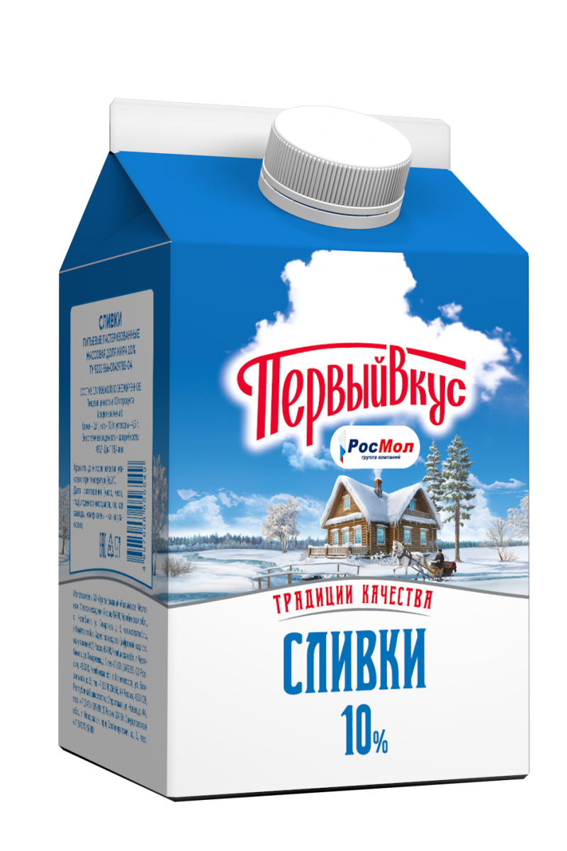 Сливки питьевые пастеризованные. Состав: сливки, обезжиренное молоко. Пищевая и энергетическая ценность в 100 г: белки – 2,6г, жиры – 10г, углеводы – 4,5 г; 118,4ккал. Хранить при температуре от +2оС до +6оС. Срок годности 10 суток.