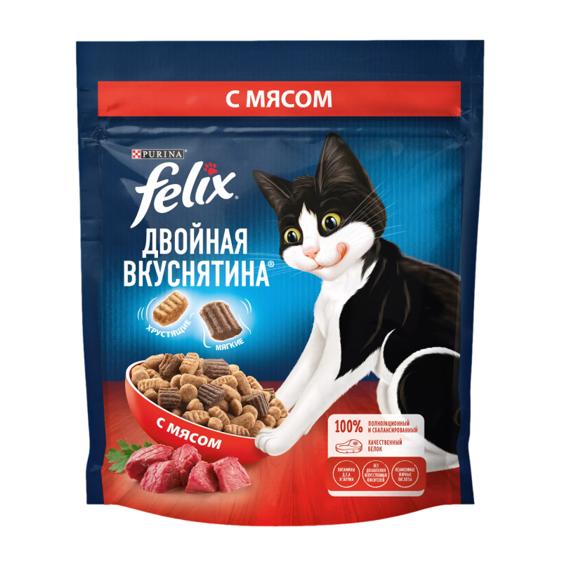 Корм сухой полнорационный для взрослых кошек, с говядиной. Состав: злаки, белок птицы и другие белки животного происхождения (включая говядину), продукты переработки растительного сырья, масла и жиры, экстракты растительного белка, глицерол, консерванты, минеральные вещества, дрожжи, сахара, аминокислоты, витамины, антиоксиданты. Добавленные вещества: мг/кг: железо 39, йод 1,3, медь 7,4, марганец 4,2, цинк 55, селен 0,089, таурин 730; МЕ/кг: витамин А 10000, витамин Д3 860, витамин Е 74. Гарантируемые показатели: белок 34%, содержание жира 12,5%, сырая зола 8%, сырая клетчатка 3%, незаменимые жирные кислоты 2,5%. Хранить в сухом прохладном месте. Срок годности 18 месяцев.