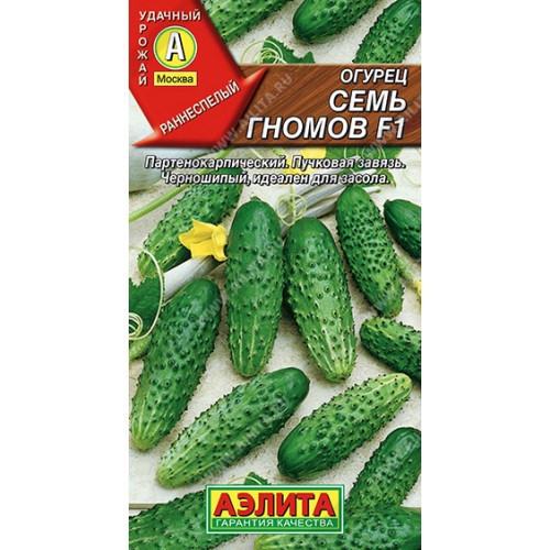 Огурец Семь гномов F1. Скороспелый партенокарпический гибрид женского типа цветения. Срок созревания 45-49дней. В узлах формируется по 1-2 завязи. Зеленцы длиной 14-18см. темногозеленого цвета, среднебугорчатые, белошипые, со средним опушением. Урожайность до 17-18кг/кв м. Используется в свежем виде и консервации.