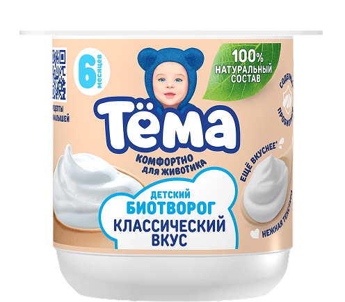 Биотворог обогащенный бифидобактериями, для питания детей старше 6-ти месяцев. Состав: нормализованное молоко, закваска молочнокислых культур и бифидобактерий. Количество бифидобактерий не менее1х10 6 КОЕ/г. Пищевая и энергетическая ценность в 100г: жиры – 4,5г, белки – 8,5г, углеводы- 4г,91ккал. Хранить при температуре от +2оС до +6оС. Срок годности: 30 суток.