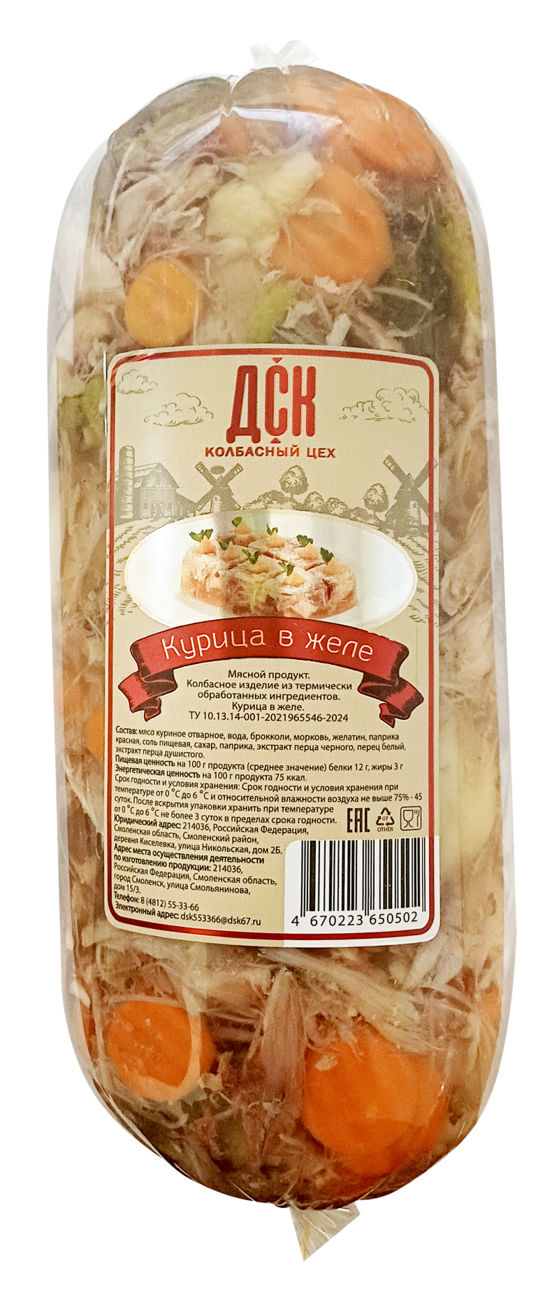 Состав: мясо куриное отварное, вода, желатин, брокколи, морковь, соль пищевая, сахар, перец черный, перец белый, перец душистый, консервант Е262. Пищевая и энергетическая ценность в 100г: белки 12г, жиры 3г; 75ккал. Хранить при температуре от 0°С до +6°С. Срок годности 45суток. После нарушения целостности оболочки продукт хранить не более 3 суток при температуре от 0°С до +6°С в пределах срока годности.