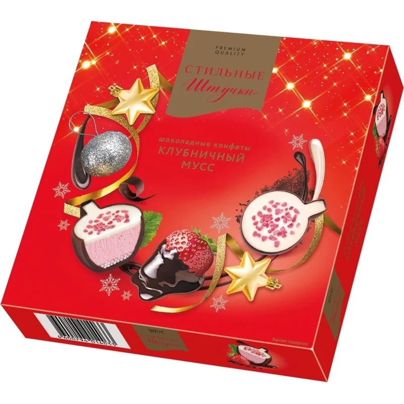 Конфеты шоколадные «Клубничный мусс». Состав: сахар, жир растительный, какао тертое, эквивалент масла какао (смесь масел растительных), сыворотка молочная сухая, ядра арахиса жареные протёртые, мука рисовая, ядра фундука жареные протертые, ядра миндаля жареные протертые, молоко цельное сухое, мука пшеничная, молочный жир, эмульгатор лецитины (соевый), клубника сушеная порошок, сироп глюкозный, ароматизатор «Клубника», молоко сухое обезжиренное, соль, масло какао, йогуртовый порошок, краситель кармины, концентрированный сок бузины, регулятор кислотности лимонная кислота, ароматизаторы: «Сливки» ванилин, эмульгатор Е492, регуляторы кислотности: лактат кальция, молочная кислота; эмульгатор Е476. Возможно содержание небольшого количества других орехов, кунжута. Пищевая и энергетическая ценность в 100г: белки 4г, жиры 43г, углеводы 46г, 590ккал. Хранить при температуре от +15°С до +21°С. Срок годности 12 месяцев.
