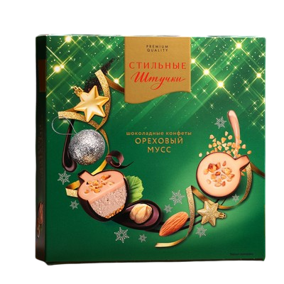 Конфеты шоколадные с начинкой «Ореховый мусс». Состав: сахар, жир растительный, какао тертое, эквивалент масла какао (смесь масел растительных), сыворотка молочная сухая, ядра фундука жареные протертые, ядра арахиса жареные протертые, ядра миндаля жареные дроблёные, ядра фундука жареные дробленые, ядра арахиса жареные дроблёные, молоко сухое цельное, молочный жир, эмульгатор лецитины (соевый), патока, соль, какао-порошок, ароматизатор «Лесной орех», эмульгатор Е 492, ароматизатор ванилин, ароматизатор «Ванильно-сливочный», эмульгатор Е476. Возможно содержание небольшого количества других орехов, глютена, кунжута. Пищевая и энергетическая ценность в 100г: белки 5,5г, жиры 44г, углеводы 43г, 590ккал. Хранить при температуре от +15°С до +21°С. Срок годности 12 месяцев.