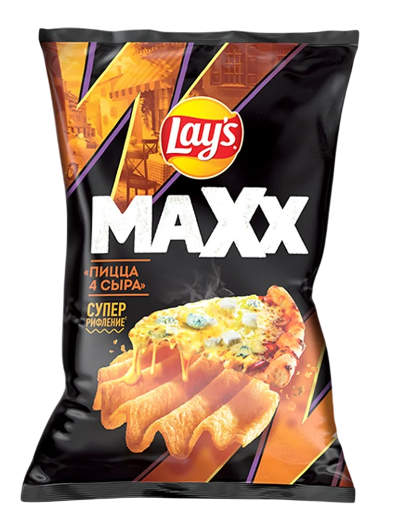 Чипсы из натурального картофеля Lays Maxx со вкусом 4 сыра. Состав: картофель, растительные масла*, ароматизатор [вкусоароматические вещества, соль, сахар, пшеничная мука, порошок молочной сыворотки, усилители вкуса и аромата (глутамат натрия 1-замещенный, 5’-инозинат натрия 2-замещенный, 5’-гуанилат натрия 2-замещенный), регулятор кислотности (лимонная кислота), термический технологический ароматизатор, краситель (экстракт паприки)]. Продукт может содержать незначительное количество сои, порошков рыбы, морепродуков, ракообразных, горчицы. Пищевая и энергетическая ценность на 100г: белки 6г, жиры 32г, углеводы 53г, 520ккал. Хранить при температуре не выше +25°С и относительной влажности воздуха не более 75%. Срок годности 6 месяцев.