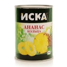 Консервы фруктовые. Ананас кольца в легком сиропе. Состав: ананас, вода, сахар, регулятор кислотности: лимонная кислота. Пищевая и энергетическая ценность в100г: белки 0г, жиры 0г, углеводы 16г, 60ккал. Хранить в сухом месте при температуре от 0°С +25°С и относительной влажности не более 75%. Срок годности 36 месяцев. Масса продукта 340г.
