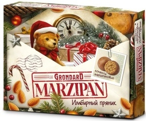 Конфеты неглазированные с корпусом из марципановой массы Имбирный пряник. Состав: сахар, миндаль 33%, сироп глюкозно-фруктозный, агент влагоудерживающий: сорбит, спирт этиловый, имбирь молотый, корица молотая, мускатный орех молотый, перец душистый молотый, кардамон молотый, гвоздика молотая, бадьян молотый, перец черный молотый, консервант: сорбат калия, какао-порошок, молоко сухое обезжиренное, ферментный препарат микробного происхождения (инвертаза), регулятор кислотности: лимонная кислота.Может содержать следы орехов, арахиса, молочного белка, яиц и продуктов их переработки. Содержит алкоголь. Пищевая и энергетическая ценность на 100г продукта: белки —6,9г, жиры — 16г, углеводы — 65,3г; 433ккал. Хранить при температуре от +15°С до +21°С и относительной влажности воздуха не более 75%. Срок годности 8 месяцев.