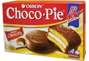 Мучное кондитерское изделие в глазури Orion ChocoPie. Состав: мука пшеничная общего назначения тип М55-23, сахар, вода питьевая, патока, жир кондитерский (рафинированные дезодорированные растительные масла (пальмовое, подсолнечное, соевое), эмульгатор (лецитин соевый), антиокислители (Е319, лимонная кислота), жир специального назначения (рафинированные и дезодорированные растительные масла (пальмовое и пальмоядровое, масло ши), эмульгаторы (лецитин соевый, сорбитан тристеарат), какао-порошок, молоко цельное сухое, разрыхлители (гидрокарбонат натрия, гидрокарбонат аммония, ортофосфат кальция 1-замещенный), глюкоза, желатин пищевой, яичные продукты, соль поваренная пищевая, какао тертое, ароматизатор (ванилин), эмульгатор (лецитин соевый), гидролизат молочного белка, загуститель (ксантановая камедь). Пищевая и энергетическая ценность в 100г: белки 4г, жиры 16,1г, углеводы 70,5г, 440ккал. Хранить при температуре от +18оС до +22оC и относительной влажности воздуха не более 65%. Срок годнос