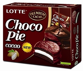 Печенье Lotte Choco Pie Cacao прослоенное глазированное. Состав: мука общего назначения тип М 55-23, сахар, патока, жир специального назначения (рафинированные, дезодорированные растительные масла, в том числе гидрогенезированные, переэтерифицированные: пальмовое, подсолнечное), заменитель масла какао нетемперируемый нелауринового типа (негидрогенезированное рафинированное пальмовое масло), масло подсолнечное (высокоолеиновое рафинированное вымороженное дезодорированное), (какао тертое, эмульгатор (лецитин соевый), вода питьевая, какао-порошок алкализованный, молоко сухое цельное, влагоудерживающий агент (глицерин), продукты яичные, сухой яичный белок, глюкоза, желатин, соль, разрыхлители (гидрокарбонат натрия, орто-фосфат кальция 1-замещенный), ароматизатор (ванилин), загуститель (ксантантовая камедь), пенообразователь (гидролизованный растительный (соевый) белок (HYFOAMA VPN)), корица молотая. Пищевая и энергетическая ценность в 100г: белки 4,1г, жиры 20г, углеводы 63,2г, 445ккал. Х
