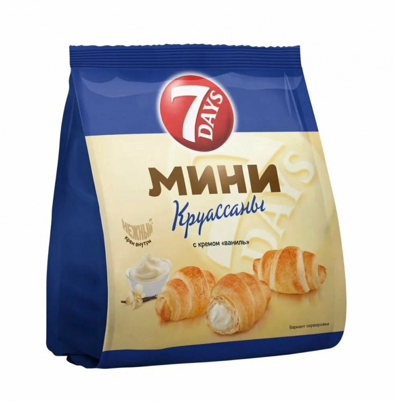 Мини круассаны с кремом со вкусом «ваниль». Состав: мука пшеничная хлебопекарная высшего сорта, вода, масла растительные (пальмовое, подсолнечное), сахар, жир растительный (пальмовый), сироп глюкозный, молоко сухое обезжиренное, декстроза, дрожжи хлебопекарные прессованные, эмульгаторы (моно- и диглицериды жирных кислот, эфиры полиглицерина и жирных кислот), соль, спирт этиловый ректификованный из пищевого сырья, продукт яичный, ароматизаторы (содержат молоко), консерванты (пропионат кальция, сорбат калия), регуляторы кислотности (ортофосфорная кислота, дигидропирофосфат натрия), загуститель (E466), лактоза (из молока). Может содержать следы орехов. Пищевая и энергетическая ценность в 100г: белки 6,1г, жиры 27г, углеводы 45г; 456ккал. Хранить при температуре выше +6°С. Срок годности 5 месяцев.