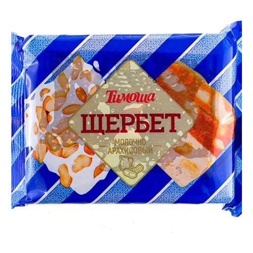 Восточные сладости типа мягких конфет. Состав: сахар, патока крахмальная, ядро арахиса обжаренное очищенное, сухая молокосодержащая смесь (цельное сухое молоко, сухая молочная сыворотка, заменитель молочного жира (пальмовое масло, подсолнечное масло)), маргарин (рафинированные дезодорированные растительные масла в натуральном и модифицированном виде, в том числе соевое, вода, эмульгаторы: моно-, диглицериды жирных кислот, эфиры полиглицерина и жирных кислот, соль, сахар, консервант сорбат калия, регулятор кислотности - лимонная кислота, ароматизатор «Масло», краситель бета-каротин, антиокислитель: аскорбиновая кислота, альфа-токоферол), белок яичный сухой, краситель - сахарный колер IV. Пищевая и энергетическая ценность в 100г: белки 4г, жиры 12г, углеводы 76г; 430ккал. Продукт может содержать следы сухого диоксида серы. Срок годности 8 месяцев при температуре не выше +25°С.