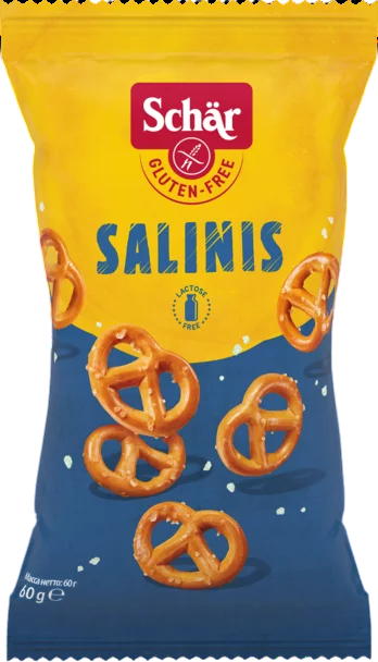 Соленые крендельки без глютена Salinis – отличный вкусный вариант для перекуса и в виде закуски. Продукт от ведущего производителя безглютеновой продукции итальянской компании Dr.Schar предназначен для людей, соблюдающих безглютеновую диету, в том числе больным целиакией и людей, склонных к аллергии на глютен.