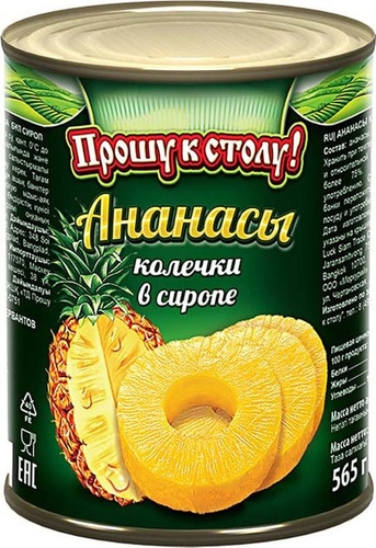 Главная / Каталог / Консервированные продукты / Ананасы Прошу к столу 565г колечки ж/б