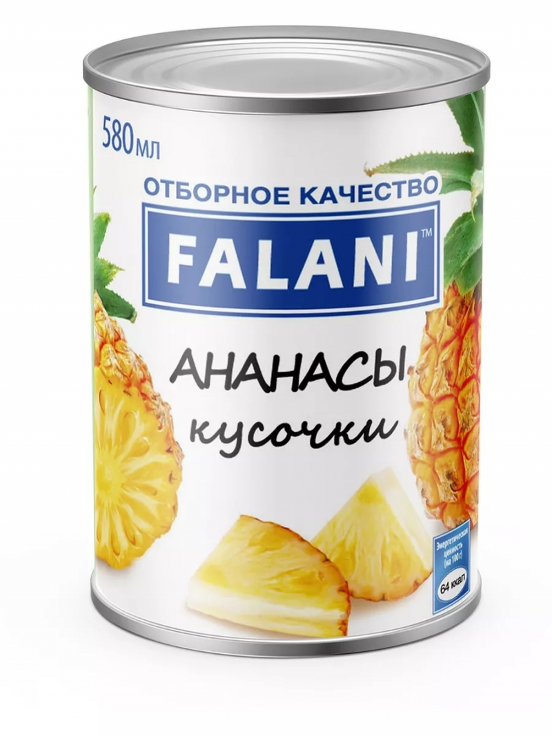 Главная / Каталог / Консервированные продукты / Ананасы Фалани 580мл кусочки ж/б