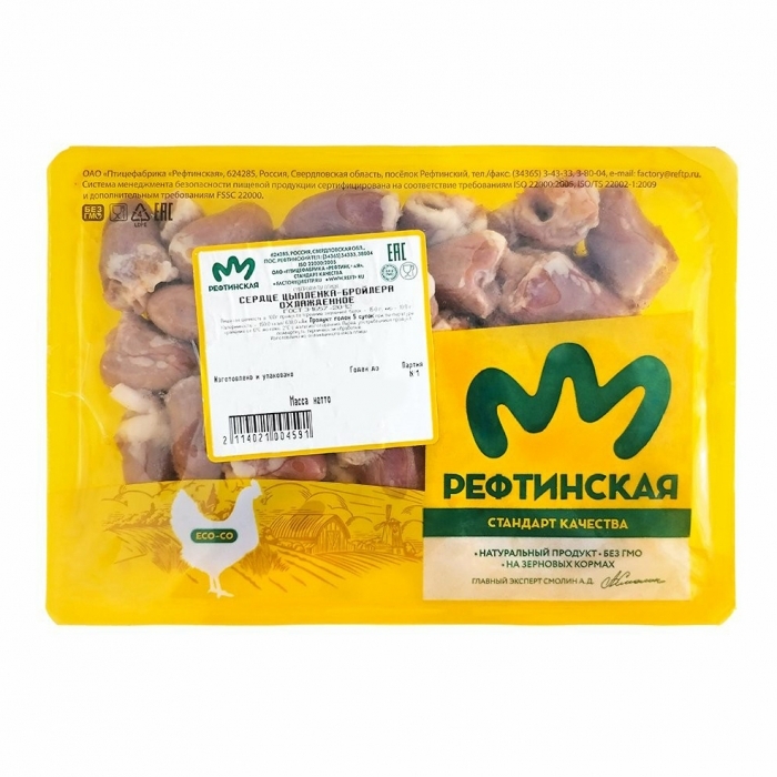 Состав: СЕРДЦЕ ЦЫПЛЁНКА-БРОЙЛЕРА ОХЛАЖДЕННОЕ. ПИЩЕВАЯ И ЭНЕРГЕТИЧЕСКАЯ ЦЕННОСТЬ в 100 г продукта: белок – 15г; жир – 10г; 150ккал. Хранить при температуре от 0оС до +2оС. Срок годности 7 суток. Перед употреблением продукт подвергнуть термической обработке. Изготовлено из охлаждённого мяса птицы.