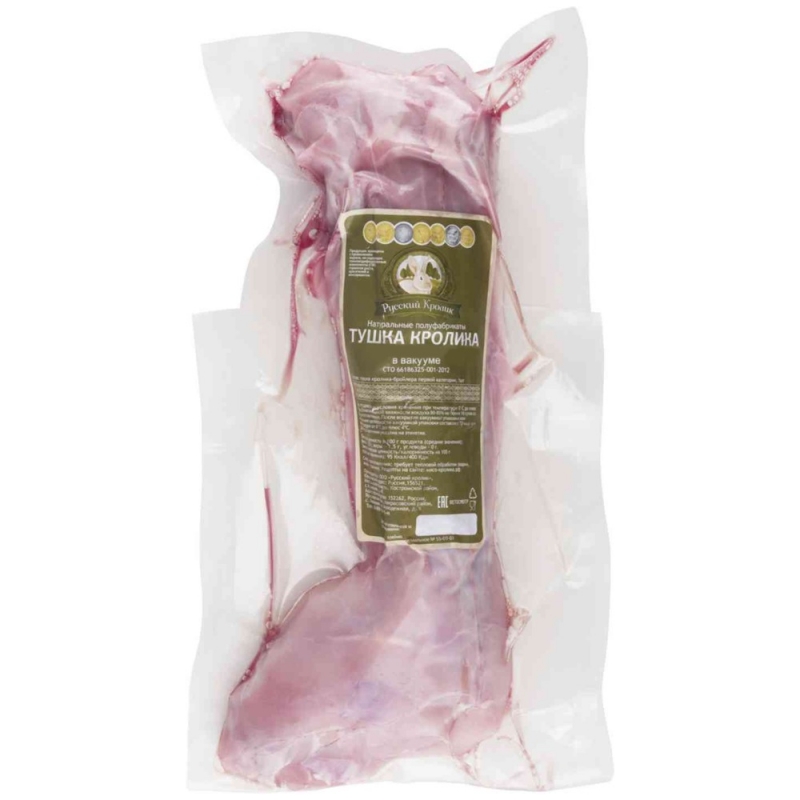 Состав: полуфабрикат натуральный тушка кролика в соответствии с требованиями СТО 66186325-001-2012. Пищевая и энергетическая ценность в 100г: белки 21г, жиры 1,5г, углеводы 0г; 95ккал. Срок годности 12 месяцев при температуре не выше минус 18оС. Продукт требует тепловой обработки.