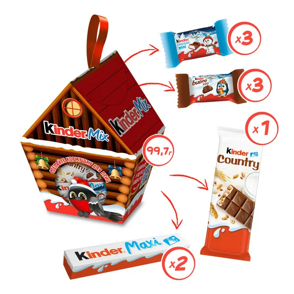 В наборе: • шоколад молочный Kinder Maxi — 2 шт. • шоколад молочный Kinder Chocolate со злаками — 1 шт. • шоколад молочный Kinder Chocolate Mini — 3 шт. • вафли Kinder Bueno Mini — 3 шт.