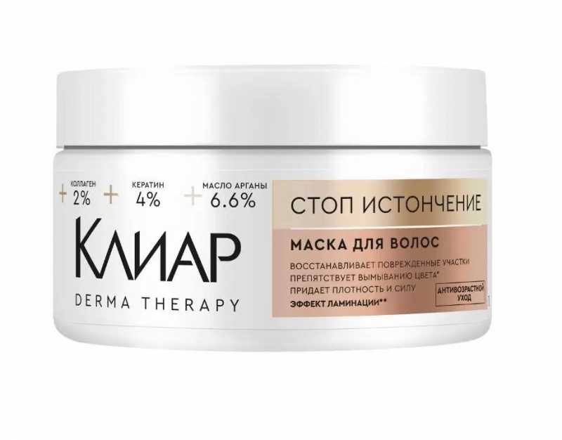 Маска для волос с кератином, коллагеном и аргановым маслом Клиар — это восстанавливающее средство, созданное для эффективного ухода за вашими локонами.Формула продукта содержит 2% коллагена', 4% кератина' и 6,6% масла арганы'. Маска Клиар Derma Therapy Стоп Истончение – это идеальное решение для восстановления поврежденных участков волос. Состав: Aqua, Cetearyl Alcohol, Stearamidopropyl Dimethylamine, Behentrimonium Chloride, Amodimethicone, Argania Spinosa Kernel Oil, Gluconolactone, Glycerin, Hydrolyzed Collagen, Hydrolyzed Keratin, Trehalose, Cetrimonium Chloride, Dipropylene Glycol, Disodium EDTA, Lactic Acid, Magnesium Nitrate, Methylchloroisothiazolinone, Methylisothiazolinone, Parfum, Phenoxyethanol, Sodium Chloride, Sodium Sulfate, Trideceth-12, Benzyl Alcohol, CI 17200, CI 19140. Срок годности 36 месяцев.