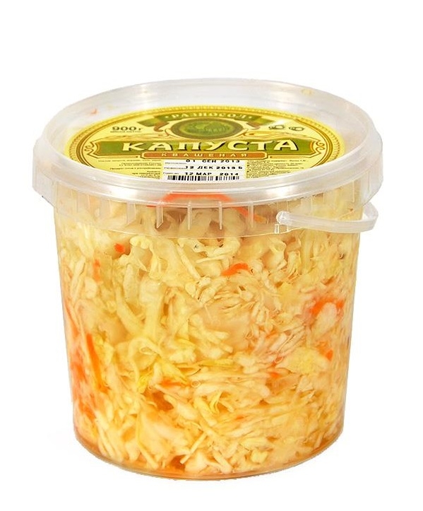 Состав: капуста белокочанная, морковь, вода, соль, сахар, уксусная кислота, бензоат натрия, лавровый лист, перец душистый, перец черный, гвоздика, семена укропа, семена кориандра. Пищевая и энергетическая ценность в 100г: белки 1,8г, жиры 0,1г, углеводы 6,4г; 35ккал. Хранить при температуре от 0°С до +6°С. Срок годности 90 суток.
