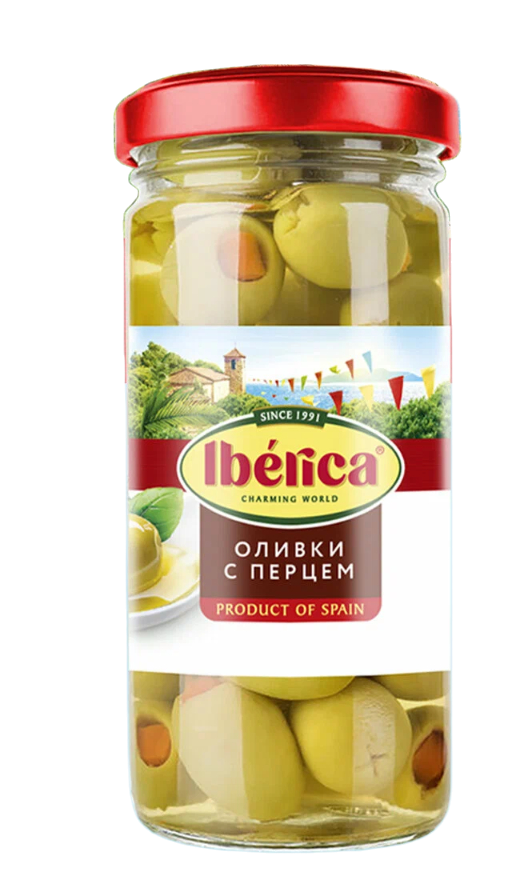 Состав: зеленые оливки, паста из перца 14% (вода, перец, стабилизатор Е401, Е415, отвердитель Е509), соль, усилитель вкуса Е621, регуляторы кислотности Е330, антиокислитель Е300. Пищевая и энергетическая ценность в 100г: белки 1,2г, жиры 10г, углеводы 0,5г; 97ккал. Хранить при температуре от +5°С до +25°С. Срок годности 36 месяцев.