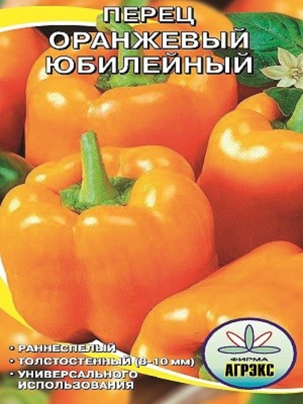 Перец Оранжевый юбилейный. Универсальный сорт, подходит для культивирования и в открытом грунте и в теплице. Период от всхода до начала плодоношения 95-100 дней. Плод массой 80-95г, толщина стенки плода 8-10мм, плоскоокруглой формы, окраска в биологической спелости оранжево-желтая, в технической – зеленая.