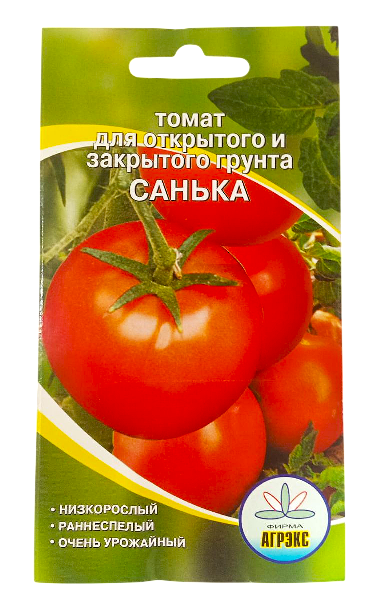 Томат Санька для открытого и закрытого грунта, раннеспелый, низкорослый. Масса плода 70-90г, плод округлый слаборебристый, красный.
