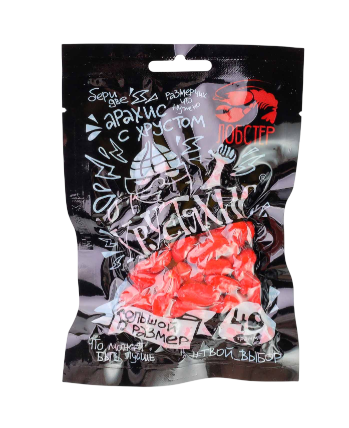Арахис хрустящий со вкусом лобстера. Состав: ядра арахиса, ароматизатор пищевой (мальтодекстрин, соль, сахар, усилители вкуса и аромата-глутамат натрия, двунатриевый гуанилат, инозинат натрия), креветка порошок (натуральные вкусоароматические вещества, вкусоароматические вещества, регуляторы кислотности (инозин монофосфат , натриевая соль, уксусная кислота0, жир растительный, рыбный порошок, специи, подсластитель сукралоза, агент антислеживающий диоксид кремния), масло растительное рафинированное дезодорированное, соль, краситель Понсо 4R. Содержит краситель, который может оказывать отрицательное влияние на активность и внимание детей. Продукт может содержать незначительное количество (следы): глютена, ракообразных, орехов, сельдерея, молочных белков, горчицы и продуктов их переработки. Пищевая и энергетическая ценность в 100г: белки – 26,3г, жиры – 46,2г, углеводы – 9,9г; 560,6ккал. Срок годности 6 месяцев при температуре не выше +25оС и относительной влажности воздуха не более 70%.
