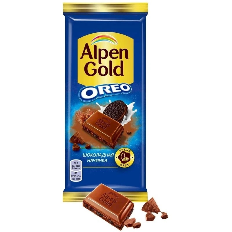 Шоколад «Альпен Гольд с шоколадной начинкой и кусочками печенья Орео. Состав: сахар, какао тертое, печенье дроблёное Орео (мука пшеничная, сахар, масло пальмовое, какао-порошок, сироп глюкозно-фруктозный, крахмал кукурузный, разрыхлители (гидрокарбонат аммония, гидрокарбонат натрия), соль, эмульгатор (лецитин соевый), регуляторы кислотности (E503(i), E524), ароматизатор), сыворотка сухая молочная, жир растительный (масло пальмовое), масло какао, молоко сухое цельное, жир молочный, молоко сухое обезжиренное, эмульгаторы (лецитин соевый, E476) ароматизатор. Может соедержать следы арахиса и других орехов. В молочной шоколадной массе содержание общего сухого остатка какао - не менее 25%, сухого обезжиренного остатка какао - не менее 2,5%, сухого общего остатка молока - не мене 12%, молочного жира - не менее 2,5%. Общее содержание какао-продуктов в молочной шоколадной массе – не менее 25%. Пищевая ценность: жиры 29г, углеводы 61г, белки 4,8г, пищевый волокна 2,7г, 527ккал. Хранить при тем