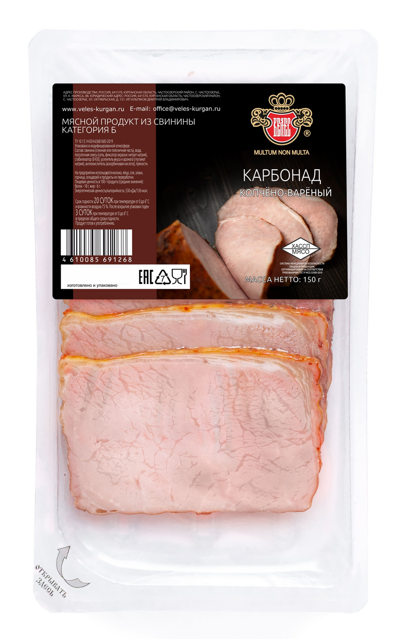 Главная / Каталог / Колбасы, сосиски, паштеты / Карбонад Велес копчено-вареный 150г нарезка