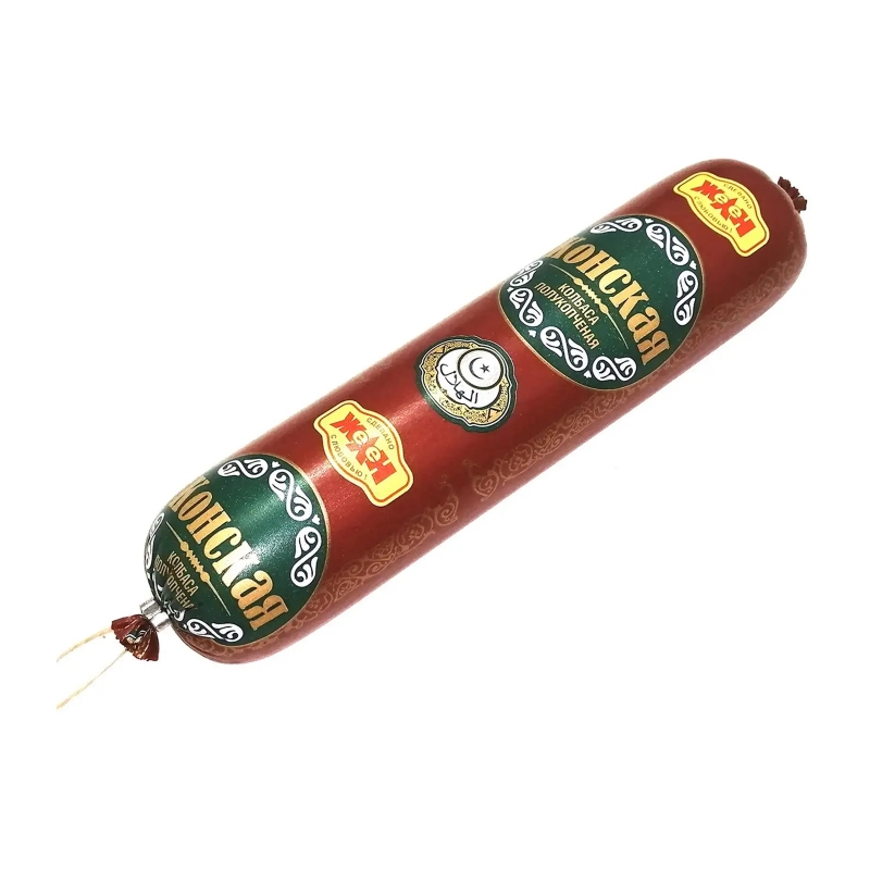 Состав: конина, мясо птицы механической обвалки, жир говяжий, вода питьевая, посолочная смесь (соль, фиксатор окраски (нитрит натрия)), комплексная пищевая добавка (регулятор кислотности (трифосфат натрия), декстроза, усилитель вкуса и аромата (глутамат натрия), натуральные ароматизаторы (белый перец, паприка, экстракт черного перца, экстракт чеснока), антиокислитель (аскорбат натрия), стабилизатор (полифосфат калия)), крахмал картофельный, чеснок. На территории предприятия используются яйца, соя, молоко, глютен, орехи, горчица и продукты их переработки. Пищевая и энергетическая ценность в 100г: белки 11г, жиры 27г, углеводы 1г; 297ккал. Хранить при температуре от 0оС до +6оС. Срок годности 45 суток.