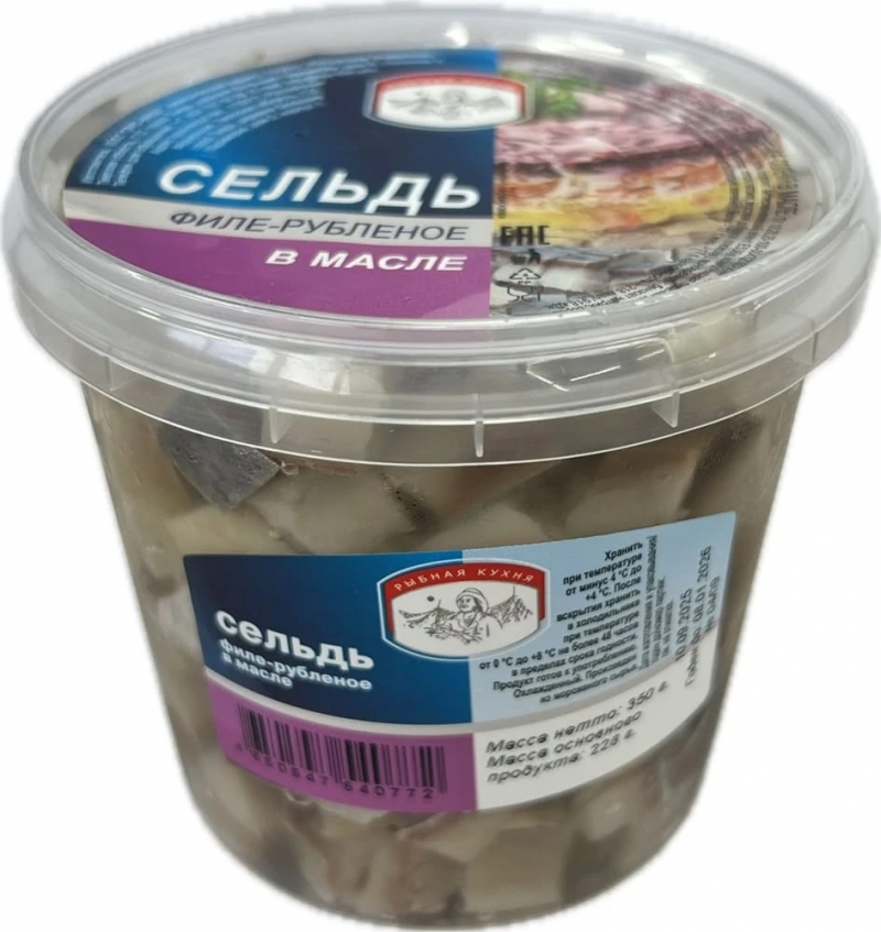 Пресервы. Сельдь тихоокеанская филе рубленое соленая в масле. Состав: сельдь тихоокеанская филе рубленое, масло подсолнечное рафинированное дезодорированное, соль (содержит антислеживающий агент Е536), комплексная пищевая добавка (усилитель вкуса и аромата глутамат натрия; регулятор кислотности лимонная кислота, стабилизатор хлорид натрия, вкусовая добавка глюкоза), консерванты: бензоат натрия, сорбат калия. Пищевая и энергетическая ценность в 100г: белки 17г, жиры 17г; 218ккал. Хранить при температуре от -4°С до +4°С. Срок годности 120 суток.