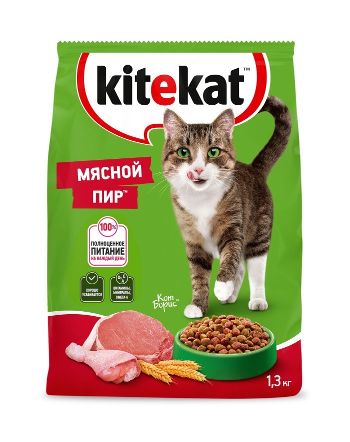 Kitekat Мясной пир – корм сухой полнорационный для взрослых кошек. Состав: продукты растительного происхождения, продукты животного происхождения, гидролизат из продуктов животного происхождения, животные жиры и растительные масла (в том числе подсолнечное масло), соль, минеральные вещества, витамины, аминокислоты (в том числе таурин), антиоксиданты, красители. Содержание питательных веществ в 100г: белок – 26г; жир – 10г; клетчатка – 3г; зола – 9г; кальций – 1,5г; фосфор – 0,9г; витамин А – 1200МЕ; витамин Е – 5,5мг. Энергетическая ценность в 100г: 340ккал. Хранить при температуре от +5°С до +35°С и относительной влажности не более 75%. Срок годности 14 месяцев.