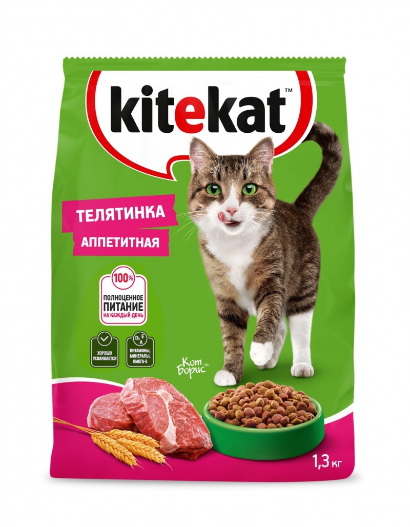 Kitekat Мясной пир – корм сухой полнорационный для взрослых кошек. Состав: продукты растительного происхождения, продукты животного происхождения, гидролизат из продуктов животного происхождения, животные жиры и растительные масла (в том числе подсолнечное масло), соль, минеральные вещества, витамины, аминокислоты (в том числе таурин), антиоксиданты, красители. Содержание питательных веществ в 100г: белок – 28г; жир – 10г; клетчатка – 3г; зола – 9г; кальций – 1,5г; фосфор – 0,9г; витамин А – 1200МЕ; витамин Е – 5,5мг. Энергетическая ценность в 100г: 340ккал. Хранить при температуре от +5°С до +35°С и относительной влажности не более 75%. Срок годности 14 месяцев.
