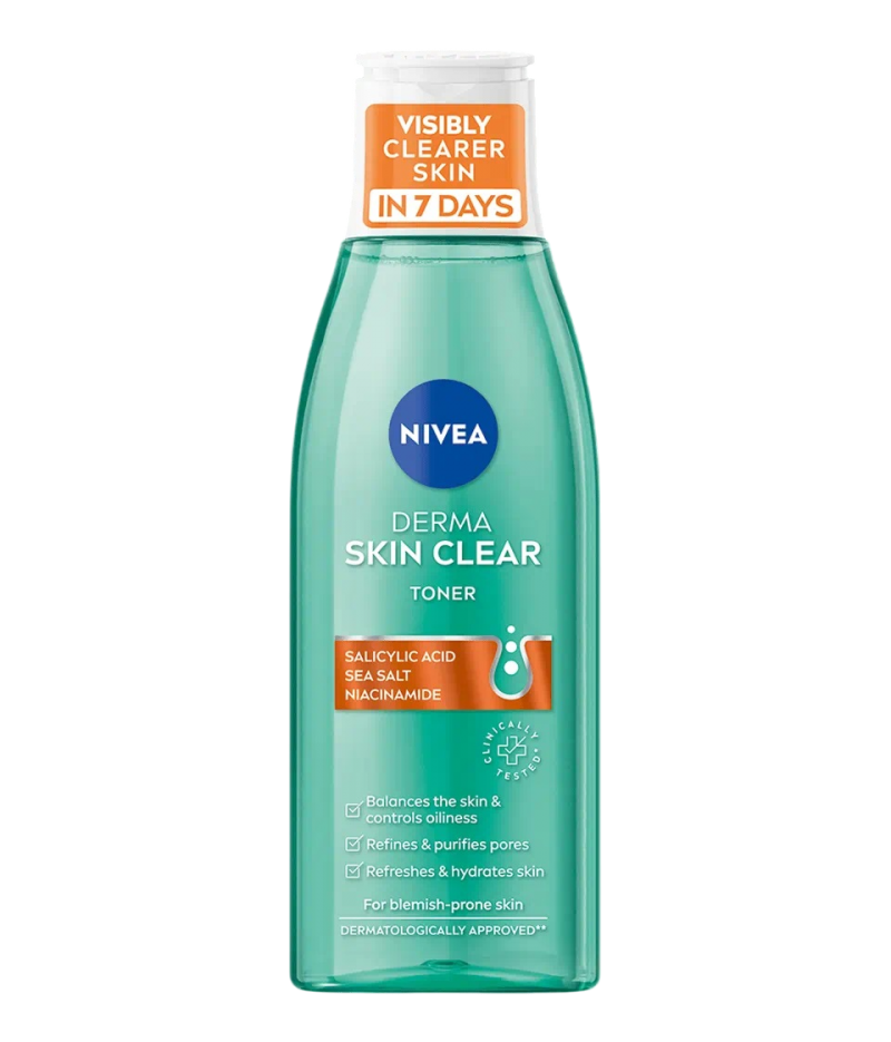 Тоник для лица с салициловой кислотой, морской солью и ниацинамидом Nivea Derma Skin Clear. Состав: Aqua, Methylpropanediol, PEG-8, Glycerin, PEG-40 Hydrogenated Castor Oil, Salicylic Acid, Maris Sal, Niacinamide, Sodium Hydroxide, Phenoxyethanol, 1,2-Hexanediol, Caprylyl Glycol, Parfum. Срок годности 36 месяцев.