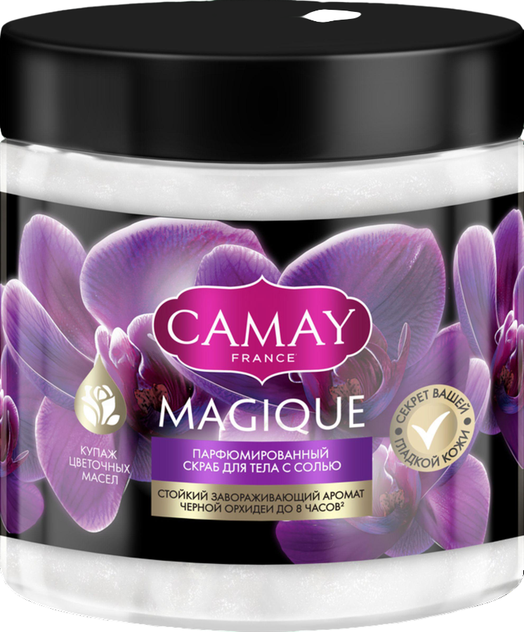 Парфюмированный скраб для тела Camay Magique. Состав: Sodium Chloride, Glycerin, Butyrospermum Parkii (Shea) Butter, Sorbitan Stearate, PEG-6 Caprylic/Capric Glycerides, PEG-7 Glyceryl Cocoate, BHT, Parfum (содержит эфирные масла лаванды, иланг-иланга, душицы), Phenoxyethanol, Sorbityl Laurate, Benzyl Salicylate, Cinnamyl Alcohol, Citronellol, Coumarin, Hexyl Cinnamal, Hydroxycitronellal, Limonene, Linalool. Срок годности 36 месяцев.