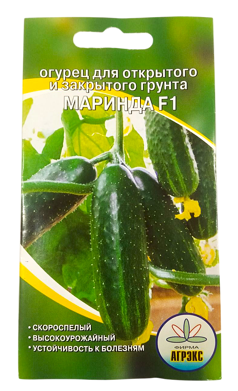 Огурец для открытого и закрытого грунта Маринда F1, раннеспелый (46-48 дней), высокоурожайный, партенокарпический (не требует опыления). Плоды длиной 10-12см, массой 65-75г.