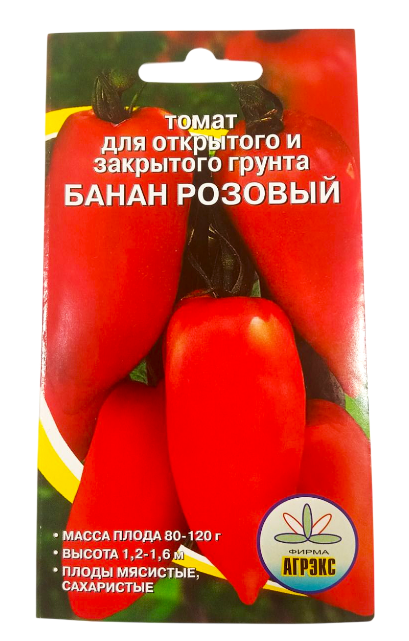 Томат для открытого и закрытого грунта Банан розовый. Среднеранний (100-110дней). Растение высотой 1,2-1,6м, масса плода 80-120г.