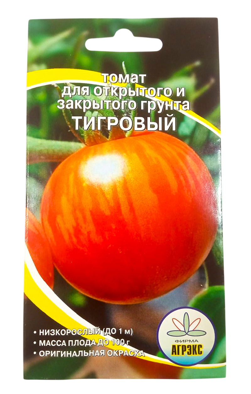 Томат для открытого и закрытого грунта Тигровый. Сорт сренеспелый. Плоды полосатые – круглые, некрупные, красные в желтую полоску. Вес плода до 100г. Растение высотой до 1м.