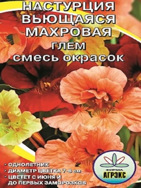 Настурция вьющаяся махровая Глем смесь окрасок. Побеги могут достигать до 150см. Листья крупные, а цветки диаметром около 8см, полумахровая структура. Настурцию этого сорта можно использовать в кулинарии (листья и стебли добавляют в салаты или добавлять размолотые семена как приправу).