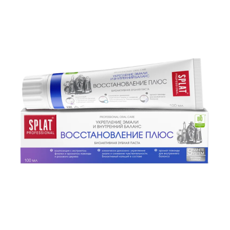Зубная паста серии Professional SPLAT Восстановление Плюс, Состав: Hydrogenated Starch Hydrolysate, Hydrated Silica, Aqua, PEG-8, Sodium Coco-Sulfate, Aroma, Cellulose Gum, Xanthan Gum, Calcium Lactate, Xylitol, PVP, Sodium Methylparaben, Propylene Glycol, Glycerin, Caviar Extract, Menthol, Citrus Aurantium Bergamia Fruit Oil, Viola Tricolor Extract, Lavandula Hybrida Herb Oil, Papain, Ananas Sativus Fruit Extract, Maltodextrin, CI 14720, CI 42090, Butylene Glycol, Limonene, Linalool. Fluoride free. Срок годности 36 месяцев.