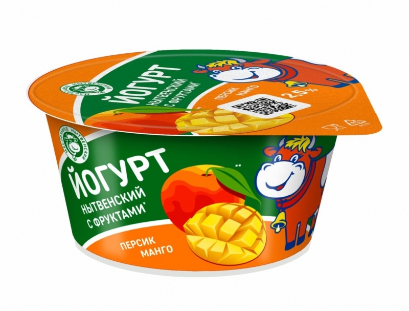 Состав: молоко нормализованное, фруктово-ягодный наполнитель (сахар, персик, вода, фруктоза кристаллическая, манго (пюре), стабилизатор крахмал модифицированный Е 1442, ароматизатор натуральный «Персик», ароматизатор «Манго», регуляторы кислотности : цитрат натрия , лимонная кислота, краситель каротин), сахар, молоко сухое обезжиренное, стабилизаторы (желатин, крахмал кукурузный, Е1422, пектин), закваска йогуртовых культур. Количество молочнокислых микроорганизмов в течение срока годности не менее 1х107 КОЕ/г. Пищевая и энергетическая ценность в 100г: белки 3,3г, жиры 2,5г, углеводы 14,6г, в т.ч. сахароза 10,2г; 94ккал. Срок годности 15 суток при температуре от +2оС до +6оС.