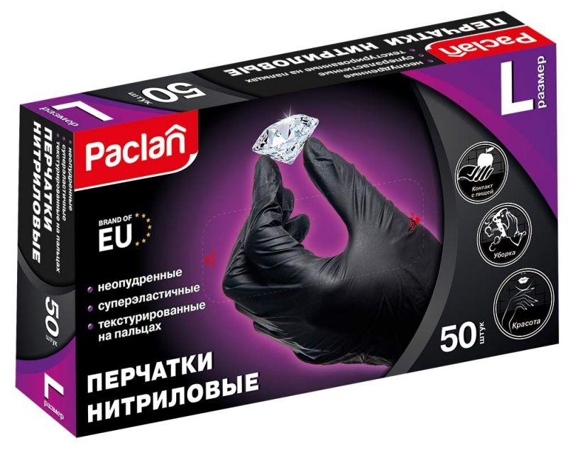 Главная / Каталог / Промышленные товары / Хозтовары / Перчатки / Перчатки нитриловые Паклан черные 50шт L