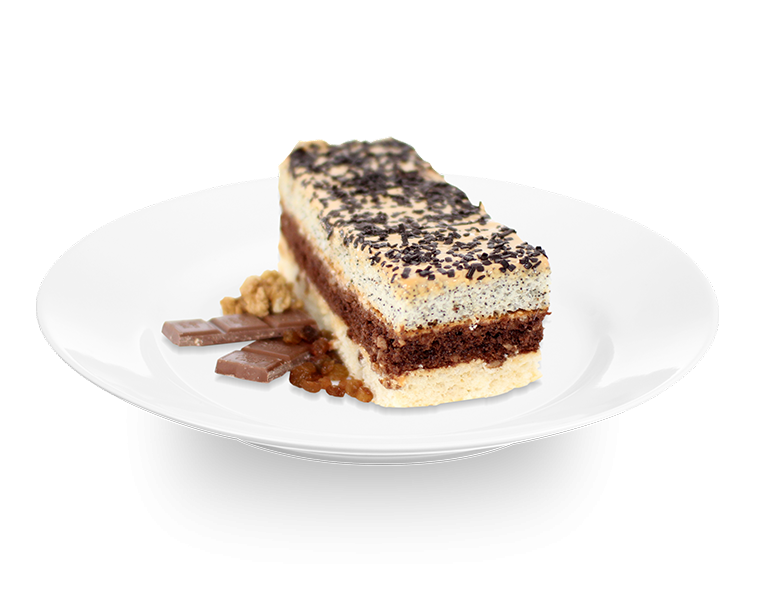 Состоит из трех бисквитных коржей с изюмом, арахисом и маком с прослойками из сливочного сметанного крема с вареной сгущенкой.