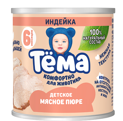 Консервы из мяса птицы, для питания детей раннего возраста, старше 6-ти месяцев. Гомогенизированные, стерилизованные. Состав: мясо индейки, крупа рисовая, масло подсолнечное, вода. Пищевая и энергетическая ценность в 100г: белки 11,6г, жиры 6,2г, углеводы 3,7г; 117ккал. Хранить при температуре от +2оС до +25оС. Срок годности: 24 месяца.