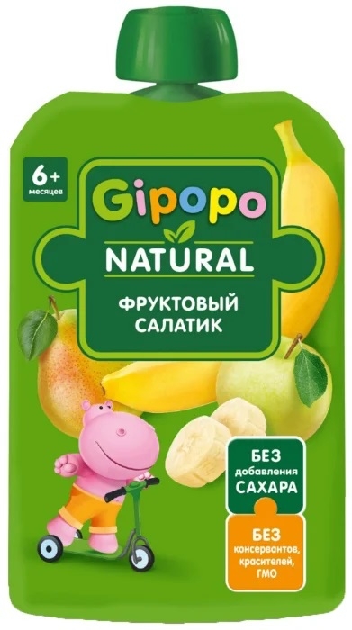 Продукт детского питания для детей раннего возраста, продукт прикорма, пюре фруктовое гомогенезированное, стерилизованное. Состав: Пюре яблочное, пюре грушевое, пюре банановое. Без добавления сахара. Содержат сахара природного (естественного) происхождения. Пищевая и энергетическая ценность в 100г: углеводы 12,9г, 52ккал. Хранить при температуре от+2оС +25оС и относительной влажности воздуха не более 75%. Срок годности 12 месяцев.