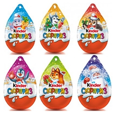 «Kinder Сюрприз» яйцо из молочного шоколада с внутренним молочным слоем с игрушкой внутри. Состав: сахар, сухое цельное молоко, масло какао, тертое какао, эмульгатор: лецитины, ароматизатор, начинка: сахар, сухое обезжиренное молоко, растительный жир, молочный жир, эмульгатор: лецитины, ароматизатор. Пищевая и энергетическая ценность в 100г: белки 8,1г, жиры 34,2г, углеводы 53,5г; 566ккал. Срок годности 9 месяцев при температуре от +15оС до +22оС.