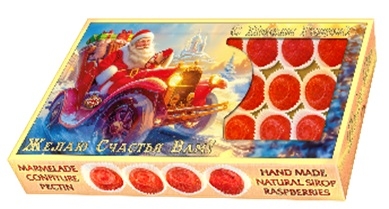 Натуральный мармелад на основе сиропа и ягод малины с добавлением пектина. Состав: натуральный ягодный сироп из крымской малины, патока, сахар, пектин, ягоды малины, лимонная кислота. Пищевая и энергетическая ценность в 100г: белки 0,2г, жиры 0г, углеводы 76г; 290ккал. Хранить при температуре от +15°С до +21°С. Срок годности 6 месяцев.