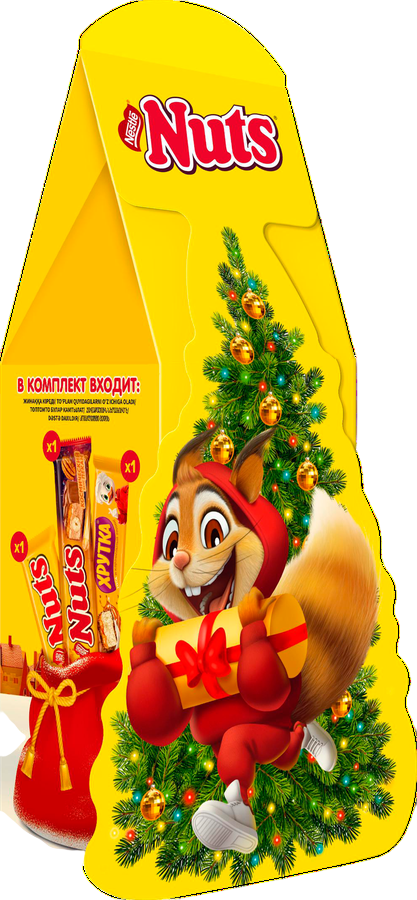 Состав набора: 1 - Конфета NUTS с фундуком и арахисом (масса нетто: 1 шт. х 16,3 г). Состав: сахар, патока, жир специального назначения (из пальмового масла), молоко сухое обезжиренное, фундук, арахис, масло какао, какао тёртое, сыворотка молочная сухая, эквивалент масла какао (масло пальмовое, масло ши), молочный жир, молоко сухое цельное, эмульгаторы (лецитины, Е476), продукты яичные, мука пшеничная (содержит глютен), ароматизаторы натуральные, мука рисовая, соль, регулятор кислотности (лимонная кислота), разрыхлитель (гидрокарбонат натрия), крупа кукурузная, крупа гречневая. Продукт может содержать: другие орехи, диоксид серы, сою и кунжут. Пищевая и энергетическая ценность в 100г: белки 5,7г, жиры 22г, углеводы 63г; 477ккал. 2 - Конфета Nuts «Космический Вкус пекан» с фундуком, арахисом, карамельной начинкой, молочной начинкой и нугой со вкусом пекана (масса нетто: 1 шт. х 60 г). Состав: Сахар, патока, жир специального назначения (из пальмового масла), фундук целый, молоко сухое об
