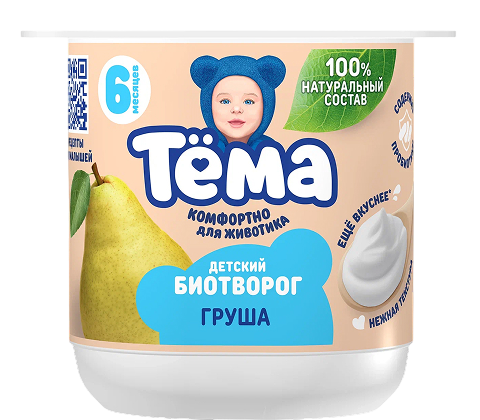 Биотворог обогащенный бифидобактериями с грушей, для питания детей старше 6-ти месяцев. Состав: нормализованное молоко, наполнитель (сахар, вода, концентрированное пюре груши, кукурузный крахмал, концентрированный лимонный сок, натуральный ароматизатор), закваска молочнокислых культур и бифидобактерий. Количество бифидобактерий не менее1х10 6 КОЕ/г. Пищевая и энергетическая ценность в 100г: жиры – 4г, белки – 7,5г, углеводы- 10,6г, 108ккал. Хранить при температуре от +2оС до +6оС. Срок годности: 30 суток.