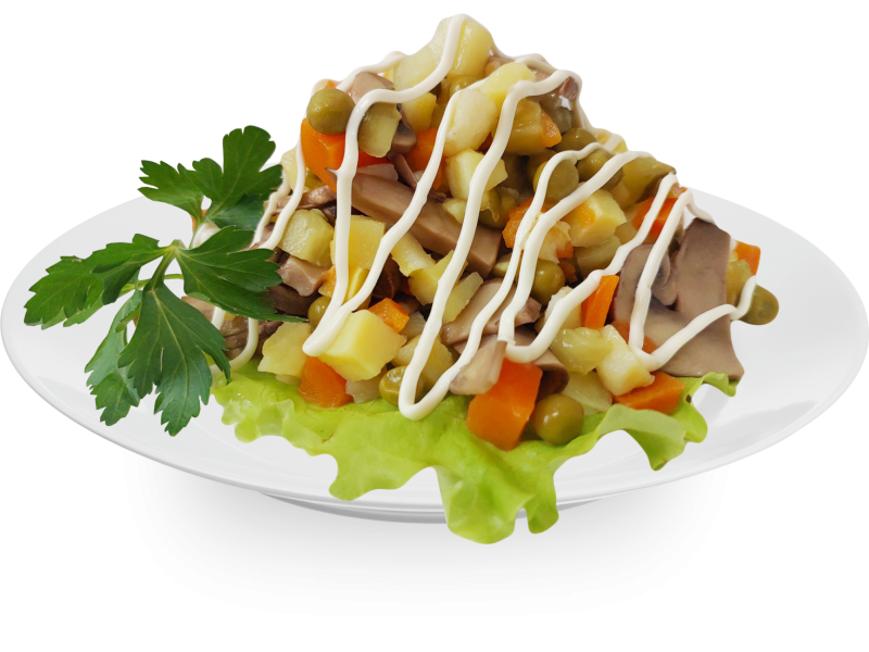 СТО 308347554-003-2018 Состав: шампиньоны свежие,картофель,морковь,огурцы консервированные,горошек зеленый консервированный,майонез постный. Без ГМО. Пищевая и энергетическая ценность в 100г.,г: б-2,4, ж-11,6, у-10,8 к-158 ккал/660 Кдж Срок годности при t 4+-2 С 12 часов .ЕАС